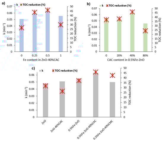 The photocatalytic activity of obtained samples was assessed by IBU degradation under simulated solar irradiation. The effect of the Fe and CAC content in the composites for IBU removal was investigated, and the results are summarized in Figure 8. According to Figure 8a, the increase of Fe content in the range of 0–0.5% in the x%Fe-ZnO-40%CAC composites resulted in an increase of the pseudo-first order reaction rate constant and TOC reduction efficiency. A further increase in the content of Fe caused a slight decrease in the rate constant; however, the mineralization of the pharmaceutical decreased but was still higher than for the composite without Fe. The highest removal efficiency was obtained for the composite ZnO-40%CAC with 0.5% of Fe, which is considered optimal Fe loading and selected for the detailed studies.