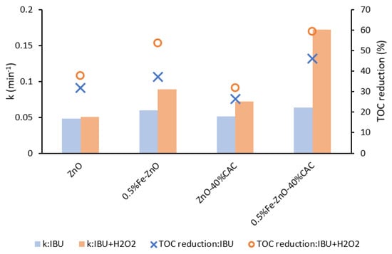 The degradation of IBU under the H2O2-assisted photocatalytic processes in the presence of selected photocatalysts was investigated, and the results are presented in Figure 9. The degradation rate constant for pure ZnO was similar both with and without H2O2. The differences in photocatalytic activity depending on H2O2 were observed for Fe-containing photocatalysts. In the case of 0.5%Fe-ZnO, the rate constant increased from 0.060 min−1 without H2O2, to 0.089 min−1 in the presence of H2O2. Also, for this sample IBU mineralization increased from 37% to 54% without and with H2O2, respectively. Moreover, the greatest enhancement of IBU removal was observed for the 0.5%Fe-ZnO-40%CAC photocatalyst, which was characterized by three times higher rate constant with H2O2 addition in comparison to the process without a supporting oxidant.