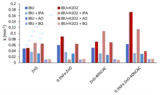 The first-order kinetic rate constant changes when the individual scavengers are applied (Figure 10). The degradation of IBU using 0.5%Fe-ZnO-40%CAC decreased in the presence of every applied scavenger during the photocatalytic process and also during photocatalytic process assisted with H2O2. The IBU degradation was mainly influenced by O2•− species [50]. The h+ (holes) plays a secondary role, whereas the contribution of hydroxyl radicals in the degradation is not remarkable. It is worth emphasizing that the degradation of IBU in the presence of ZnO and ZnO-40%CAC assisted by H2O2 was not inhibited and even accelerated in the case of ZnO with IPA and AO, as well as ZnO-40%CAC with IPA. This phenomenon can be explained by the decomposition of H2O2 on photocatalysts either by reduction (Reaction 5) or oxidation (Reaction 6):