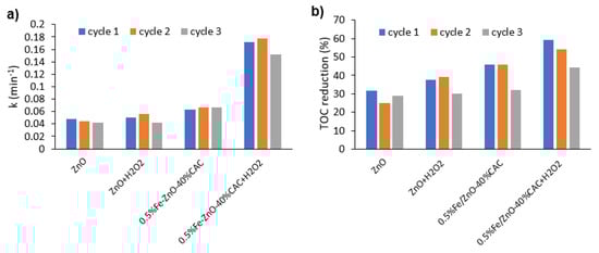 Furthermore, the stability of ZnO and 0.5%Fe-ZnO-40%CAC was confirmed in the subsequent photocatalytic cycles of degradation with and without H2O2 addition, as shown in Figure 11. Sample ZnO and 0.5%Fe-ZnO-40%CAC, after three cycles of photodegradation, maintained photocatalytic stability, but a slight reduction of TOC reduction was observed after the third cycle in the presence of 0.5%Fe-ZnO-40%CAC. On the other hand, after three subsequent photocatalytic processes coupled with H2O2, the degradation rate slightly decreased. Nevertheless, the photocatalytic degradation efficiency of 0.5%Fe-ZnO-40%CAC/H2O2 was still remarkably improved compared to the degradation processes of ZnO and ZnO/H2O2 samples.