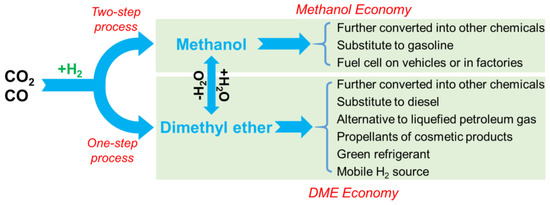 However, DME can also be employed as an intermediate product of CO2 hydrogenation (Figure 1). During the process of CO2 hydrogenation, formation of DME exhibits a higher energetic efficiency than formation of HCs or alcohols [14], e.g., 97% of energy is stored in DME during CO2 hydrogenation. Moreover, DME is a non-toxic, non-carcinogenic and non-corrosive chemical applied as a propellant of cosmetic products. DME is also employed as a green refrigerant due to its low global warming potential, and as a promising ultra-clean fuel alternative to liquefied petroleum gas and diesel due to its high cetane rating [15]. More importantly, for both CO hydrogenation and CO2 hydrogenation, producing DME is thermodynamically more favorable than methanol. These advantages demonstrate that as the intermediate in the CO2 hydrogenation, DME exhibits more potential than methanol. Therefore, a new chemical economy centered on synthesizing and converting DME, the so-called DME economy [16], is expected to be significantly developed in the chemical industry in the future.
