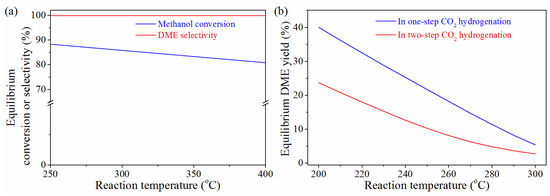 One-step CO2 hydrogenation to DME should be more efficient than two-step CO2 hydrogenation to DME. In the case of the one-step procedure, the thermodynamic results are the same as those of the CO2-to-DME reaction shown in Figure 2. In the case of the two-step procedure, we can assume that the equilibrium conversion is achieved in each reactor, then the final equilibrium thermodynamic results can be calculated. The thermodynamic results of methanol dehydration to DME are shown in Figure 3a. We observe that in the methanol dehydration [42], the methanol conversion slightly decreases with increasing reaction temperature, while the DME selectivity remains at nearly 100%. Further, the equilibrium DME yields for the one-step and two-step CO2 hydrogenation to DME are calculated, shown in Figure 3b. It is observable that the DME equilibrium yield in the one-step procedure is higher than that in the two-step procedure, indicating that the one-step CO2 hydrogenation to DME is thermodynamically favorable. Therefore, it could be a promising technique in the future DME economy.