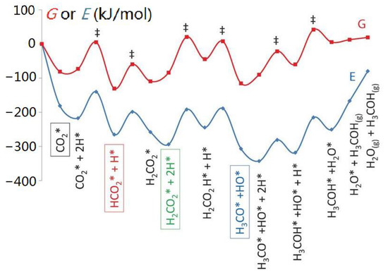 Energy (E) and standard Gibbs free-energy (G) pathway calculated for the CO2 hydrogenation to methanol over Cu/ZrO2. Reproduced with permission from Larmier et al. [81], published by John Wiley and Sons, 2017.