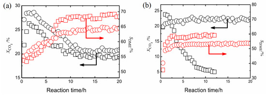 CO2 conversion (XCO2) and selectivity of dimethyl ether (SDME) with (square) and without (circle) H2S in the gas feed. (a) CaO–CeO2–Pd/HZSM-5; (b) Cu–ZnO–Al2O3/HZSM-5. Conditions: 250 °C, 3 MPa, 1600 mL·g−1·h−1, H2/CO2 = 4.4. Reproduced with permission from Chu et al. [93], published by Elsevier, 2017.