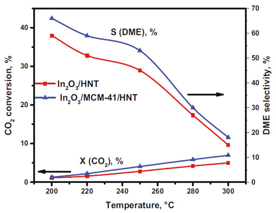 Based on these facts, Pechenkin et al. [31] prepared a bifunctional catalyst of In2O3/halloysite nanotubes to catalyze CO2 hydrogenation. Their results (Figure 8) indicate that the DME selectivity reaches 65% at 200 °C; however, the increasing reaction temperature inhibits DME selectivity and improves methanol selectivity. At 300 °C, DME selectivity is only 20%. The authors declared that the exothermicity of the methanol dehydration inhibited the formation of DME with increasing reaction temperature. Therefore, in spite of the high stability, the catalytic activity and DME selectivity over the oxide-based catalysts are still low with increasing reaction temperature.