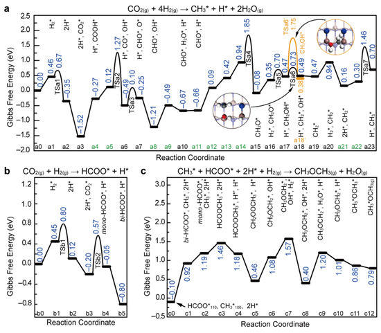 The density functional theory calculation results of CO2 hydrogenation over GaN. (a) Gibbs free energy diagram of the CO2 hydrogenation to methyl (CH3 *) on the GaN(100) plane. (b) Gibbs free energy diagram of the CO2 hydrogenation to formate (HCOO*) on the GaN(110) plane. (c) Gibbs free energy diagram for the coupling of HCOO* and CH3 * to CH3OCH3 * on the (110)/(100) interface. TS: transition states. Reproduced with permission from Liu et al. [33], published by Springer Nature, 2021.