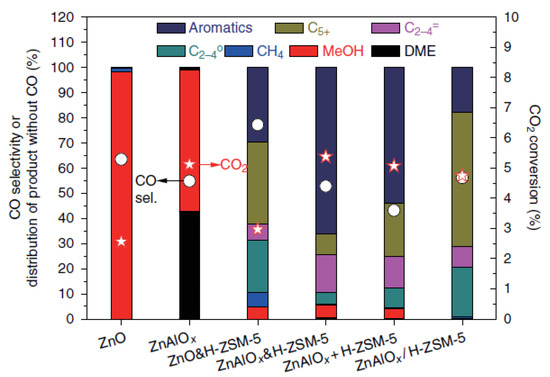 - Ni, Y.; Chen, Z.; Fu, Y.; Liu, Y.; Zhu, W.; Liu, Z. Selective conversion of CO2 and H2 into aromatics. Nat. Commun. 2019, 9, 1026–1032. [Google Scholar] [CrossRef] [PubMed]