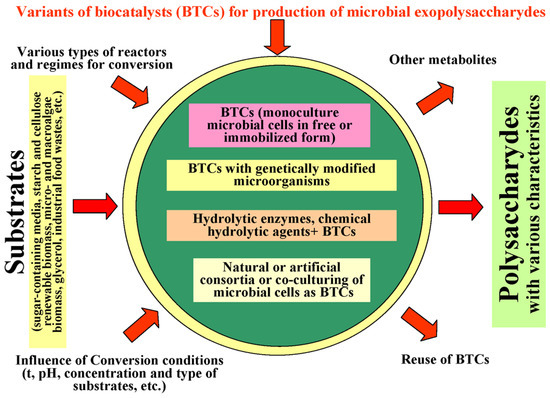 The choice of BTCs determines the variety of substrates and their possible concentrations for conversion to EPS. Most microbial cells used as BTCs are capable of converting simple sugars (mono- and disaccharides) into PS. These sugars can be obtained by hydrolysis of various renewable raw materials and biomass sources. Hydrolysis methods can be different, and various chemical agents and/or enzymes, including enzymatic complexes, can be used for these purposes [15,32,59,63,82,85].
