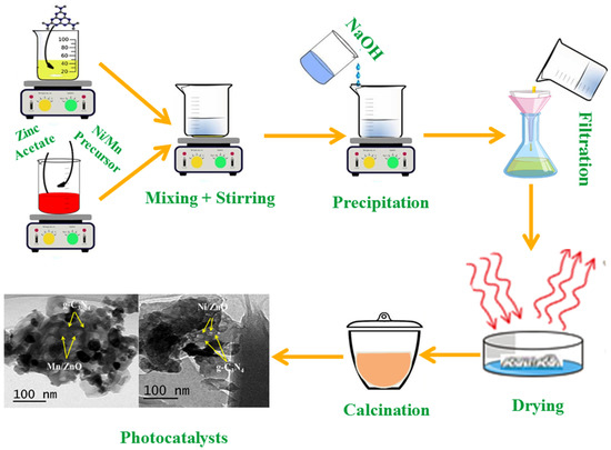 A range of targeted Ni/GZ and Mn/GZ NCs with varying g-C3N4 percentages (20, 30, 40, 50, 60, 70, and 80 wt.%) were produced via the PEG-assisted chemical co-precipitation method [38]. For the preparation of Ni/20GZ NCs, 0.34 gm of g-C3N4, 0.01 M Ni(NO3)2·6H2O, and 0.1 M of Zn(CH3COO)2·2H2O (2.20 g) were placed in a beaker and homogenized in 200 mL of deionized water (D. I). Then, 10 mL of PEG solution was added, and the mixture was stirred on the magnetic stirrer for 1 h. Finally, orange-brown precipitates were obtained by adding 2 M NaOH solution. After filtering off the precipitates, they were rinsed with 100% ethanol and D. I water. The precipitates were then dried at 85 °C and calcinated in an oven at 560 °C for 5 h (5 °C·min−1). The similar method was used to produce Ni/GZ and Mn/GZ NCs containing other percentages (20, 30, 40, 50, 60, 70, and 80 wt.%) of g-C3N4; the percentages for different combinations are detailed in Tables S1 and S2. For the synthesis of Mn/GZ NCs, the (CH3COO)2Mn·4H2O salt was used as the Mn precursor, and the remaining steps were the same as detailed for Ni/GZ NCs. g-C3N4/ZnO NCs and ZnO NPs were also synthesized for comparative study, as explained by Mudassar et al. [37]. The main steps involved in synthesizing NCs are given in Figure 1.