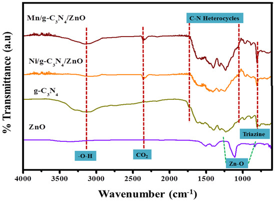 Figure 2 shows a comparison of the FT-IR spectra of the photocatalysts in the 4000–450 cm−1 wavenumber band. The observed band at 879 cm−1 in the FT-IR spectrum of ZnO confirms the presence of the metal–oxygen bond and the absence of all other functional groups [11]. Stretching of the O-H bond causes the peak at around 3300–3450 cm−1, while bending of the O-H bond causes the peak at about 1696 cm−1 [11]. The bending at 1504 cm−1 is caused by H-O-H vibrations, which suggests that the ZnO NPs absorbed H2O. A wide-ranging band at 3178 cm−1 in the FT-IR spectrum of g-C3N4 appeared due to O-H bond stretching; the peaks in the range 1500–2000 cm−1 are due to the stretching vibrations of C=N, and peaks in the range 1500–1000 cm−1 are due to C-N bond stretching [42]. A peak at 805 cm−1 indicates the triazine unit. Also, a band at 2355 cm−1 can be accredited to adsorbed carbon dioxide in all the samples [43]. The FT-IR spectra of the Ni/GZ and Mn/GZ composites contain the peaks corresponding to both ZnO and g-C3N4, signifying that the composites were formed successfully [43,44,45].