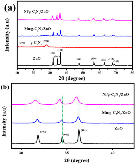 XRD patterns of ZnO, g-C3N4, and (Ni/Mn)/g-C3N4/ZnO NCs (a) Magnified XRD patterns of ZnO and (Ni/Mn)/g-C3N4/ZnO NCs (b).