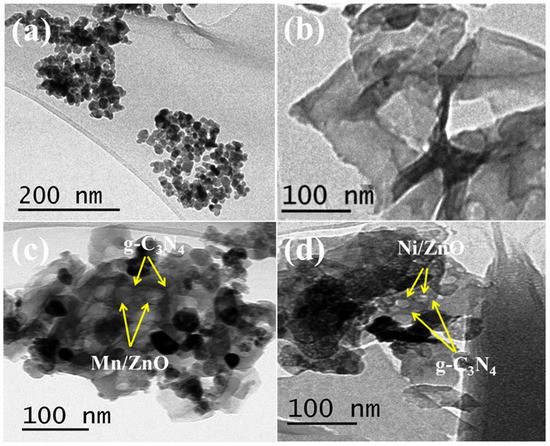 Morphological analysis of ZnO (a), g-C3N4 (b), Ni/g-C3N4/ZnO (c), and Mn/g-C3N4/ZnO (d) by TEM.