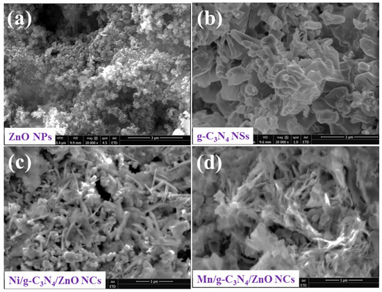 Morphological analysis of ZnO (a), g-C3N4 (b), Ni/g-C3N4/ZnO (c), and Mn/g-C3N4/ZnO (d) by SEM.