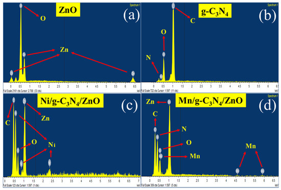 EDX analysis of ZnO (a), g-C3N4 (b), g-C3N4/ZnO (c), Ni/g-C3N4/ZnO (c), and Mn/g-C3N4/ZnO (d).