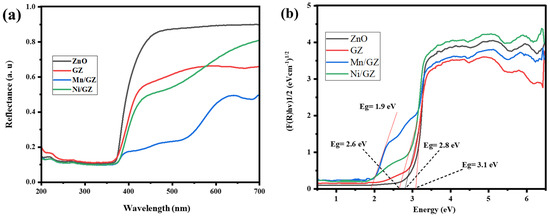 UV-vis DRS experiments were employed to investigate the optical characteristics of the synthesized samples, as shown in Figure 7a. The corresponding Eg values of the synthesized samples were assessed by plotting the Kubelka-Munk function, as shown in Figure 7b [54]. The ZnO sample’s reflectance band edge was about 375 nm, and it exhibited the greatest band gap value of 3.1 eV. In contrast, Mn/GZ NC had the smallest band gap energy of 1.9 eV. When g-C3N4 was incorporated into ZnO, the UV-vis reflectance decreased (or the absorption increased) throughout the entire wavelength range. These results are in accord with earlier results [55]. The band edge of GZ photocatalysts was somewhat expanded to a longer wavelength after adding g-C3N4. The same trend was also observed for Mn/GZ and Ni/GZ samples. Further, the integration of Ni/Mn ions into ZnO along with the addition of g-C3N4 broadened the light absorption of Mn/GZ and Ni/GZ photocatalysts into the visible region, as compared to that of pure ZnO [56]. The estimated band gap energies for GZ and Ni/GZ NC were 2.8 and 2.6 eV, respectively. These results indicate that the rate of e/h+ pair recombination is reduced in Mn/GZ and Ni/GZ NCs.