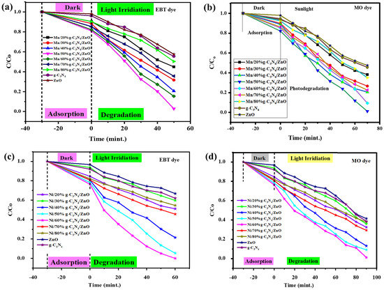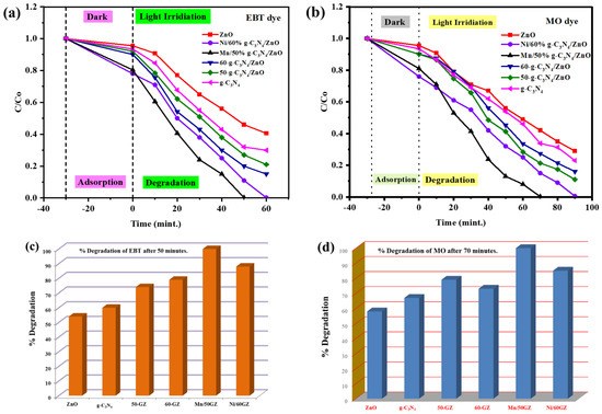 The photocatalytic decoloration efficiency levels of Mn/g-C3N4/ZnO NCs against EBT and MO dyes are given by Figure 8a,b, respectively. The photocatalytic activity of Mn/GZ NCs increased with increasing concentration of g-C3N4 up to 50 wt.%. Thus, 50 wt.% g-C3N4 is the optimal concentration, and increasing the g-C3N4 concentration beyond this (<50 wt.%.) causes a reduction in the photocatalytic efficiency of Mn/GZ NCs (Figure 8a,b). Under the impact of sunlight, the Mn/50GZ NC totally decolorized MO and EBT in 70 and 50 min, correspondingly. Likewise, Ni/60GZ NC showed the best photocatalytic efficiency against EBT and MO dyes as compared to other Ni/GZ NCs (Figure 8c,d). The observed optimal concentration of g-C3N4 for Ni/GZ NCs was 60 wt.%. The Ni/60GZ NC completely decolorized EBT and MO in 60 and 90 min, respectively.