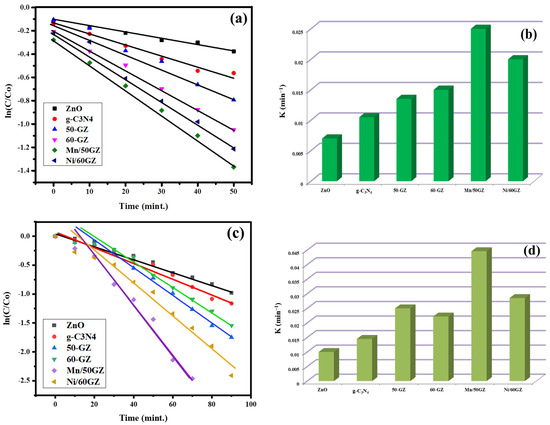 In the second phase, the comparative photocatalytic efficiency of Mn/50GZ and Ni/60GZ NCs was observed against EBT and MO dyes. From Figure 9a–d, it is evident that Mn/50GZ NC had better photocatalytic efficiency than Ni/60GZ NCs against both dyes. According to recent research, the optical, electrical, and catalytic characteristics of g-C3N4 and ZnO are significantly improved by the addition of Mn and Ni. So, this could be a reason for the highest photocatalytic efficiency of the Mn/50GZ and Ni/60GZ NCs compared to g-C3N4 and ZnO. Additionally, Mn ions have a greater effect on the optical, electrical, and photocatalytic capabilities of g-C3N4 and ZnO than do Ni and other metal ions [60]. This could be the cause for the Mn/50GZ NC’s superior photocatalytic activities when compared to Ni/60GZ NC and other synthesized composites.