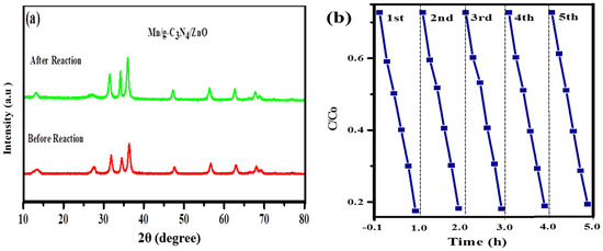 A photocatalyst must sustain its stability and endurance under repeated photocatalytic activities in order to be useful in practical applications. Five consecutive photocatalytic recycling experiments were performed to monitor the stability of the Mn/50GZ NC. In the recyclability test, the Mn/50GZ NC kept up its rate of dye degradation. The composite’s dye decoloration efficiency did not decrease significantly even after the fifth recycle, as shown in Figure 11a. Interestingly, following the fifth cycle, there were no discernible variations in the XRD profile of the Mn/50GZ NC (Figure 11b). Possible explanations for the small reduction in catalytic efficiency of the nanocomposite involve partial blockage of active sites. The Mn/50GZ NC might thus function as a reliable, reusable, and efficient photocatalytic material.