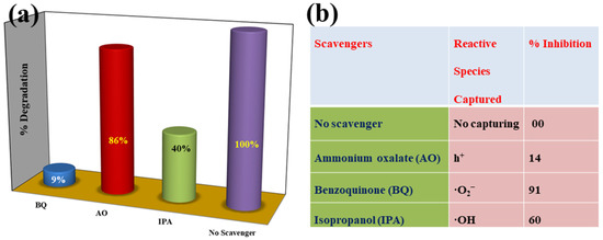 Scavenger effects (a) and the capture of reactive species with percentage inhibition (b).