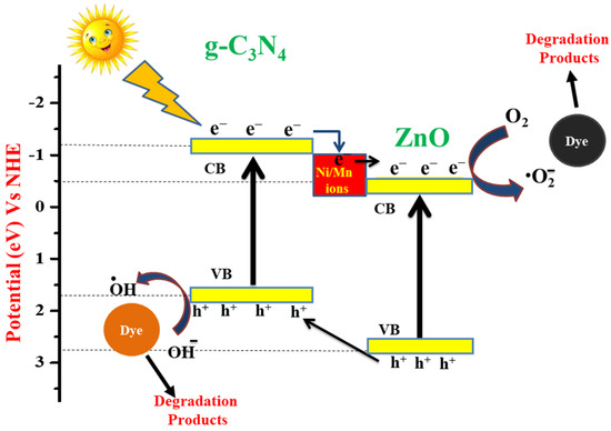 The enhanced decoloration of EBT/MO dyes by Ni/GZ and Mn/GZ NCs may be accredited to the production of e−/h+ pairs in the produced photocatalysts, as shownvia schematic sketch (Figure 13). When sunlight irradiates the NCs, both ZnO and g-C3N4 are excited, and e/h+ couples are formed on their respective conduction bands (CB) and valence bands (VB) [18]. ZnO and g-C3N4 valence bond electrons are promoted to their conduction bands.The excited electrons from the CB of g-C3N4 (−1.12 eV) are transported to the CB of ZnO (−0.5 eV). On the basis of the CB/VB edge potentials, Photo-induced electrons may easily migrate from the g-C3N4 conduction band (CB) to the CB of ZnO. Simultaneously, the h+ in the VB of ZnO might shift to g-C3N4, because ZnO has higher VB potential than g-C3N4 [70]. To enhance the electron transportation and reduce e/h+ pair recombination, the Mn/Ni metal ions in the Mn/GZ and Ni/GZ NCs not only function as a facilitator at the g-C3N4 and ZnO interface but also decrease the Eg value of ZnO [62]. The produced e and h+ react with the water and oxygen adsorbed on the photocatalyst surface to form radicals (•OH and •O2−) [71]. These radicals are used to decolorize dye molecules by converting them into low-molecular-weight intermediates, which are then oxidized into H2O, CO2, and inorganic ions.