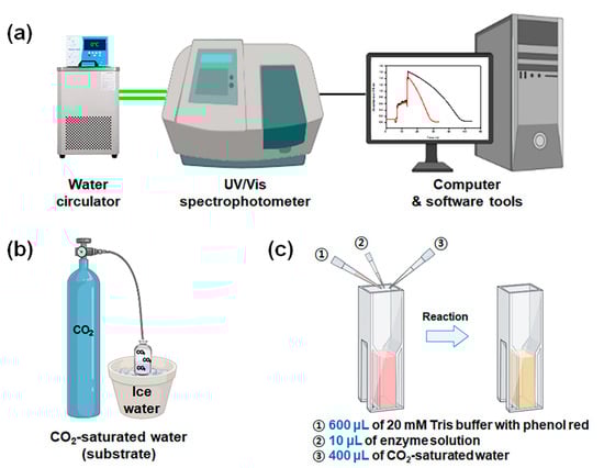 The facile, precise, and accurate assay for the colorimetric determination of CO2 hydration activity. (a) Instrumental setup for spectrophotometer equipped with temperature-controllable cell holder. (b) Preparation of CO2-saturated water as the enzyme substrate. (c) Components of the CO2 hydration reaction. Figures were created with BioRender.com.