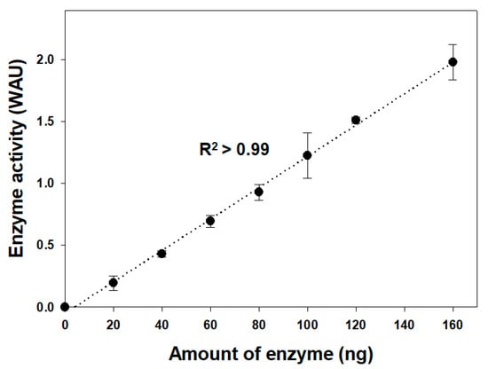 Experimental validation of the assay. The direct proportionality between the amount of enzyme and the measured activity is shown. Error bars represent standard deviations from two independent experiments.