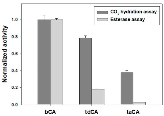 Among the eight distinct families, the α-family CAs are the most studied, and many recent studies have been conducted using α-CAs as the model or the target CAs. As α-CAs can catalyze ester hydrolysis in addition to the CO2 hydration, the facile esterase assay has been routinely utilized to assess and compare the activities of α-CAs. In this study, we compared the activities of several α-CAs including bCA, Thermosulfurimonas dismutans CA (tdCA), and Thermovibrio ammonificans CA (taCA) by using both the CO2 hydration assay and the esterase assay. The measured activity of ester hydrolysis was not commensurate with that of CO2 hydration (Figure 4). For example, the activity of bCA was 2.6-fold higher than that of taCA when assessed by the CO2 hydration assay; however, bCA showed 35.4-fold higher activity than taCA when the esterase assay was used (Figure 4). Although the discrepancy between the CO2 hydration activity and the esterase activity of α-CA has been shown in previous studies [17,21,22,23,24], this limitation is not well-known and may lead to serious misinterpretation of enzyme activity. To conclude, the CO2 hydration assay should not be substituted by the esterase assay.