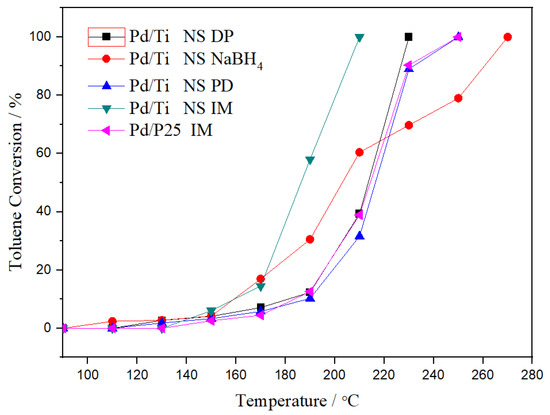 - According to the experimental results, the catalyst prepared by the impregnation method had smaller Pd particles and more active sites. The smaller the Pd particles, the better the catalytic performance. The 100% conversion of toluene was achieved at 210 °C on Pd/ TiO2-IM. The catalytic activity of Pd / TiO2 catalyst prepared by the illumination (Pd/TiO2-PD) and deposition–precipitation (Pd/ TiO2-DP) methods was lower than that of Pd / TiO2 catalyst prepared by immersion method. Compared with the other synthesis methods, Pd in the impregnation method may be dispersed better in the synthesis process and the particles are smaller, so that more Pd active sites can be spread on the TiO2 nano-sheet carrier.