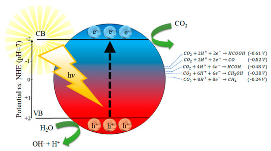 Titanium dioxide (TiO2) has been the most widely used photocatalyst since the earliest reports. It has many valuable properties: high photocatalytic activity, stability, inertness to chemical corrosion, and low toxicity. In addition, TiO2 can perform CO2RR to generate value-added products with good efficiencies, such as formic acid (HCOOH; 2954 μmol g−1 h−1) and formaldehyde (HCHO; 16,537 μmol g−1 h−1), under UV irradiation; however, to achieve these high efficiencies it was necessary to use high pressures (7–20 bar), a high temperature (80 °C), and Na2SO3 as a sacrificial agent [41].