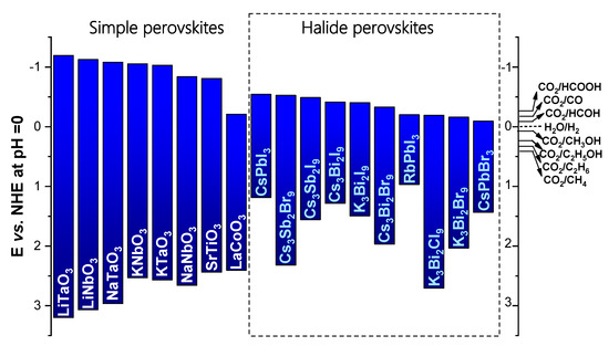 - Band structure. Generally, perovskite materials have adequate redox potentials in their valence and conduction bands for CO2RR. Figure 2 shows the band structures of selected perovskite-structured materials. The bands were calculated by Equations (1) and (2), considering the band gap (Eg) of each material, the absolute electronegativity (X), and the energy of free electrons (Ee) on the hydrogen scale (4.5 eV). In general, halide perovskites exhibited less negative conduction potentials than the simple perovskites; however, they have the thermodynamical potential required to reduce the CO2 to different solar fuels.