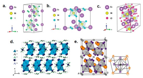 Crystal structure of the A3Bi2X9 family: (a) Cs3Bi2I9, (b) Cs3Bi2Br9, (c) Cs3Bi2Cl9, (d) MA3Bi2Br9, and (e) Rb3Bi2I9. Adapted from [100,101,102].