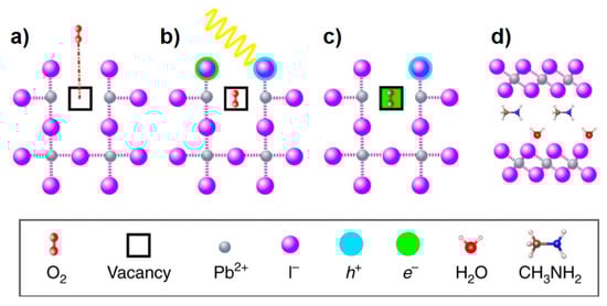 On the other hand, the combination of oxygen and light can also promote the decomposition of the bismuth halide perovskites through a photo-oxidation process [109]. This process occurs due to the photocatalytic properties of the material itself and starts with the absorption of light with energy equal to or higher than the band gap value of the material, which promotes an electron transfer from the CB to the VB. Then, the photogenerated electrons in the perovskite react with the adsorbed O2 to form superoxide radicals (O2∙-), which can start the decomposition of this material. This process has been previously demonstrated in the MAPbI3 perovskite [109,110], and its mechanism is schematized in Figure 5. The first step is the oxygen diffusion into the lattice (Figure 5a), then the light absorption in the perovskite leads to the generation of electrons and holes (Figure 5b), which react with the adsorbed oxygen to generate the superoxide radicals (Figure 5c). Finally, this, promotes the degradation of the perovskite to PbI2, H2O, I2, and CH3NH2 (Figure 5d) [109].