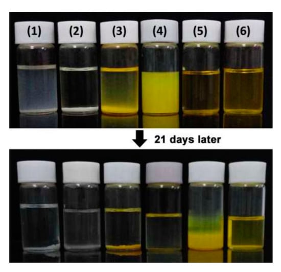 Photos of the double perovskite Cs2AgBiBr6 dispersed in various the solvents: (1) dimethyl formamide, (2) acetone, (3) isobutanol, (4) ethyl acetate, (5) chloroform, and (6) octane [128].