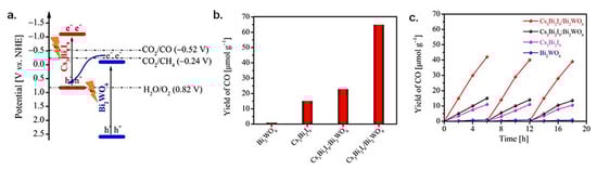 Implementation of an extrinsic approach to increase the efficiency and stability of Cs3Bi2I9: (a) Band coupling, (b) Comparative CO generation, and (c) Stability tests of Cs3Bi2I9–Bi2WO6 heterojunction. Adapted from [137].
