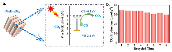 The encapsulation of bismuth halide perovskites is another option to provide stability through their support on porous materials. Previous studies suggest that mesoporous encapsulation enhances the stability of halide perovskites and prevents halide ion exchange [141]. However, it is still unclear whether the mesoporous structure provides stability against moisture, since H2O molecules can penetrate into the pores to degrade the perovskite. Even so, a recent report demonstrated good stability in the Cs3Bi2Br9 perovskite encapsulated in the porous structure of the MCM-41 molecular sieve, as is shown in Figure 9a. This strategy allows the stable production of CO (17 μmol g−1 h−1) after 8 consecutive cycles (Figure 9b) [142].