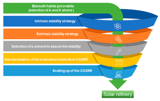 Several solutions have been proposed to mitigate the environmental impact of the high CO2 concentration in the atmosphere. The efforts have been diverse, and there are certain approaches that stand out. For instance, the promulgation of environmental regulations focuses on carrying out preventive actions to avoid the emission of pollutants into the atmosphere. Another option to reduce CO2 emissions is to improve the energy efficiency of the already-established fossil fuels, since this would result in a better use of these energetic resources [3,4]. Likewise, it is possible to use renewable fuels whose combustion reaction generates products with a lower environmental impact, e.g., natural gas, methanol, biogas, or alternative energy sources that do not involve the use of fossil fuels. However, these fuels are commonly obtained through the use of nonrenewable and highly polluting fossil fuels. Alternatively, some technologies allow the use of CO2 as a raw material in different processes in order to synthesize many industrial utility products (commodities) [5,6,7,8,9]. One of these processes is the production of short-chain hydrocarbons (solar fuels) through heterogeneous photocatalysis from CO2 reduction [10,11,12,13,14,15]. This is one of the most promising technologies to help mitigate CO2 pollution, since it can make use of sunlight to reduce CO2, employing semiconductors and water. In this process, it is possible to capture and transform CO2 into nonharmful products that, in some cases, can serve different purposes. However, the implementation of this technology at higher scales has been limited by the low efficiency of the photocatalysts. Nonetheless, materials with perovskite structure have been reported to exhibit an outstanding efficiency in CO2RR. Thus, in this work, we discuss recent advancements, challenges, and improvement strategies using a family of compounds which have been little-explored despite their interesting properties: bismuth halide perovskites (A3Bi2X9; ABi3X10, etc.; where A = monovalent cations and X = halogens). This review aims to propose innovative strategies to design promising materials for photocatalytic CO2RR that could serve in helping close the gap in current efforts to reach global sustainability and reduce the excessive concentration of CO2 in the atmosphere.