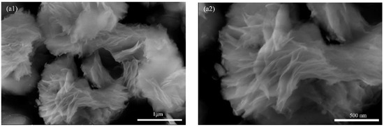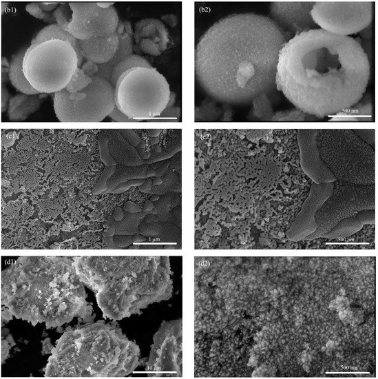 SEM images of fresh FlYZr (a1,a2), SpYZr (b1,b2), ReYZr (c1,c2), BuYZr (d1,d2).