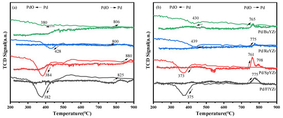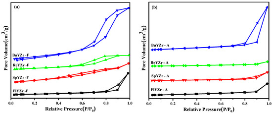 Figure 3 shows the obtained isotherms, and Table 1 summarizes the surface area, pore volume, and average pore diameter of all the samples. Among the fresh samples, SpYZr and BuYZr samples have larger specific surface areas, 82.7 m2·g−1, and 106.7 m2·g−1, respectively. A higher surface area of support favors Pd dispersion and sintering resistance [30]. The ReYZr sample has the smallest specific surface area, which is only 6.5 m2·g−1. The specific surface area of the material drops sharply, the pore volume is obviously reduced, and the average pore diameter increases under high temperatures. Among them, the FlYZr and BuYZr samples still have a relatively large specific surface area.