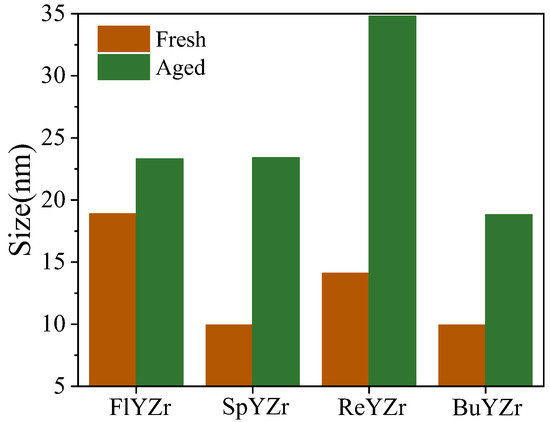 Figure 5 shows the crystalline size of Y-ZrO2 oxides with different morphologies. It can be seen that both the fresh and aged bulk. Y-ZrO2 samples have a smaller particle size, indicating that they have good anti-sintering ability, which is consistent with the results of SEM analysis.