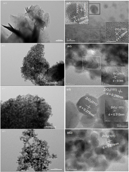 The morphologies of the obtained Pd/Y-ZrO2 are observed by TEM and HRTEM. As shown in Figure 6, obvious Pd particles can be seen from the HRTEM image of Pd/FlYZr. Its particle size is within 5–10 nm, which is basically consistent with the calculated results of dispersion (Table 2). The HRTEM image of Pd/FlYZr (a2) shows that the exposed crystal plane of ZrO2 is mainly the (101) plane of t-ZrO2. TEM images of Pd/SpYZr, Pd/ReYZr, and Pd/BuYZr (b1, c1, d1) show Y-ZrO2 particles with a size of about 10 nm, 15 nm, and 10 nm. HRTEM (b2, c2, d2) image shows that the exposed crystal plane of SpYZr is mainly attributed to the (101) plane of t-YxZ1−xO2. The exposed crystal planes of ReYZr are the (011), (−111), and (111) planes of m-YxZ1−xO2, of which the (−111) plane is the main one. The exposed crystal plane of BuYZr is the (101) plane of t-YxZ1−xO2. Among the exposed plane, the (−111) plane is the most stable surface of monoclinic zirconia [39], and the (101) plane of t-ZrO2 is more prone to distortion. This lattice strain or volume defect can promote the migration of oxygen from the body to the surface and improve activity. Therefore, the (101) surface of t-ZrO2 is more reactive than the (−111) surface of m-ZrO2 [26].