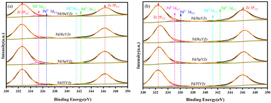In order to further understand the chemical state of palladium species on the surface of Pd/Y-ZrO2 with different morphologies, XPS measurement was carried out, and the results are shown in Figure 8. There are six electron binding energy peaks in the Pd 3d XPS spectrum of the Pd/Y-ZrO2. Two signals around 336.6 eV and 342.4 eV are attributed to the characteristic peaks of Pd2+ 3d5/2 and Pd2+ 3d3/2, respectively. The other respective signals of 335.5 eV and 341.6 eV are attributed to the characteristic peaks of Pd0 3d5/2 and Pd0 3d3/2, respectively. In addition, the peaks with bond energies around 332.6 eV and 346.3 eV are attributed to the characteristic peaks of Zr 3p3/2 and Zr 3p1/2, respectively [40]. The relative percentage of Pd species can be obtained by the area ratio of the Pd2+ 3d5/2 and Pd0 3d5/2 peaks, as shown in Table 3. It can be seen that the Pd2+ content of the flower-like, spherical, and bulk catalysts are relatively low, indicating that the active metal Pd in the Pd/FlYZr, Pd/SpYZr, and Pd/BuYZr catalysts are hard to be oxidized [41]. After aging, the relative percentage of Pd2+ on the surface of Pd/FlYZr, Pd/SpYZr, Pd/ReYZr, and Pd/BuYZr catalysts decreased significantly due to the PdO decomposed into metallic Pd0 under high temperature. The interaction between Pd and YxZr1−xO2 is weakened, thereby promoting the decomposition of PdO.