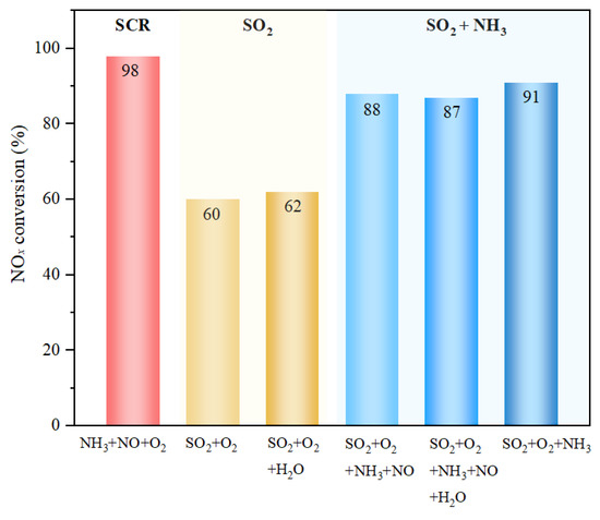 Over the past decades nitrogen oxides (NOx) that are produced from mobile and stationary sources have led to many environment problems [1]. The selective catalytic reduction (SCR) of NOx using ammonia as the reductant is one of the most promising deNOx technologies [2]. Ceria-based catalysts have attracted plenty of interest due to some advantageous features including high NOx conversion, nontoxicity, and low cost [3,4,5,6]. Recently, the activity and hydrothermal stability of ceria-based catalysts have been improved by inducing WO3 and SnO2 as a promoter, realizing over 90% NOx conversion at 300−550 °C after hydrothermal-aging at 1000 °C, as reported by He et al. [7,8]. This means the application scenarios of ceria-based catalysts are broadened, such as used downstream of the diesel particulate filter (DPF). However, in typical application scenarios, especially coal-fired power plants or the aftertreatment system of marine diesel engines, the effluent gases always contain a certain concentration of SO2. Thus, SO2 resistance is one of the most important characteristics of SCR catalysts. The deposition of cerium sulfates and ammonium bisulfate has been recognized as the main factor of deactivation of ceria-based catalysts. The deactivation of these catalysts in the presence of SO2 is sensitive to reaction temperatures. Zhang et al. [9] reported that with the increase of reaction temperature from 180 to 300 °C, the content of cerium sulfates increased significantly, accompanied with the decreased deposition of ammonium sulfates/bisulfates. Zhang et al. [10] found that the sulfation process was gradually worsened with raising the treating temperature, and the sulfate species over CeO2 changed from surface sulfates to bulk-like ones, and then to bulk ones. These studies indicate that different sulfur species are formed on ceria-based catalysts at different temperature ranges, which affect NH3-SCR activity significantly.