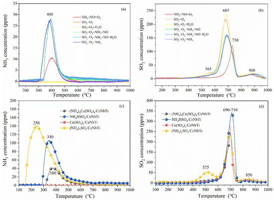 To further verify the deposits on the treated catalysts, one group of reference samples was prepared and their TPD curves are shown in Figure 2c,d. Among these samples, (NH4)2SO3, NH4HSO4, Ce(SO4)2, and (NH4)4Ce(SO4)4 were chosen as the representatives of ammonium sulfites, ammonium bisulfates, cerium sulfates, and ammonium ceria sulfates, respectively. The NH3 desorption occurs at a much lower temperature (around 250 °C) over (NH4)2SO3/CeNbTi. Comparatively, the NH3 desorption peak appears at 340 and 380 °C for the NH4HSO4 and (NH4)4Ce(SO4)4 impregnated catalysts, respectively, which are close to those (400 °C) over the catalysts that were poisoned in the NH3-containing atmospheres Figure 2a.