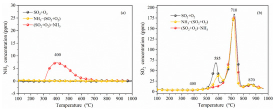 Then, a reverse sequence was adopted for purging gases. The catalyst was first pretreated in NH3 for 30 min, aiming to saturate NH3 adsorption, and then the feeding gas was switched to SO2 + O2. It is interesting to find that the sulfite-related SO2 peak significantly decreases in intensity and almost no NH3 desorbs. In this case, the adsorbed NH3 is firstly consumed by gaseous SO2 via forming ammonium sulfite and subsequent decomposition, as well as driven by competitive adsorption of SOx. Then, the continuous passing with SO2 + O2 produces ceria-based sulfite and sulfate species. It is noted that the sulfate-related SO2 desorption peak decreases slightly in intensity after purging with NH3 (Figure 3b). It demonstrates that NH3 can remove surface sulfites but release the deposited sulfates to a small extent within the limited time. Thus, the reduced sulfate deposits in the presence of NH3 (Figure 3b) should be ascribed to a great extent to other factors such as competitive adsorption between NH3 and SO2.