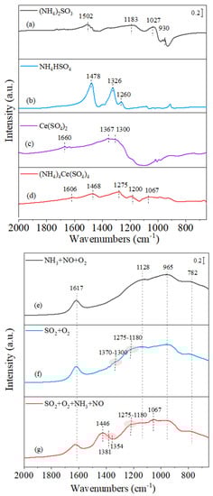 The IR spectrum of the CeNbTi that was treated in a simple SCR condition is shown in Figure 4e as the background. The band at 1617 cm−1 is assigned to adsorb H2O from the reaction between SO2 and surface hydroxyl groups [33]. The band at 965 cm−1 is attributed to characteristic vibrations of Nb=O bond in surface NbOx species [23] and the one at 1128 cm−1 is due to modes of Nb-O-Nb stretching vibration [38,39]. The stretching modes of Ce-O-Ce bands generally results in a band at 729 cm−1 [34], which shifts to 782 cm−1 due to interacting with Nb2O5 [38]. As for the spectrum that was collected over the catalyst upon exposure to SO2 + O2 (Figure 4f), the sulfate-related bands can be observed. There are two broad bands ranging at 1370–1300 and 1275–1180 cm−1 that are ascribed to the asymmetric stretching frequencies of the O=S=O bond and S-O bond of bidentate sulfate species, respectively. SO2 + O2 + NH3 +NO was chosen as a representative of three NH3-containing poisoning atmospheres. As shown in Figure 4g, the spectrum of the obtained catalyst exhibits a characteristic band at 1446 cm−1. It is assigned to the asymmetric bending vibrations of ionic NH4+ that is bound to Brønsted acid sites that are provided by surface sulfates (i.e., NH4HSO4 and (NH4)4Ce(SO4)2). Considering the similar intensities of the 1478 and 1326 cm−1 bands for NH4HSO4 (Figure 4b), the extra intensified band at 1446 cm−1 may mean the formation of ammonium cerium sulfate to a great extent. Another evidence is the band at 1067 cm−1 that is attributed to Ce-bonded bidentate sulfates. The broad band at 1275–1180 cm−1 may come from HSO4−1, CeSO4, and (NH4)4Ce(SO4)4. Other adsorption bands of sulfates at 1381 and 1354 cm−1 are attributed to asymmetric stretching frequencies of O=S=O species that are related to the formation of Ce(SO4)2.