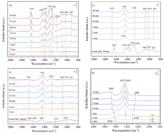 Figure 5a shows the DRIFT spectra of adsorbed species over CeNbTi catalyst in a SO2 + O2 flow at 100 °C as a function of time. As the signals that were obtained by performing the DRIFTS experiments at 300 °C are much weaker, the adsorption of reactants and products becomes more significant by reducing the operating temperature to 100 °C. Hereby, the sulfur poisoning and ammonium protecting effects are amplified, although the specific mechanisms may be somewhat different at two temperatures. The band at 1268 cm−1 is assigned to bidentate sulfates [35], while several small features at 1180, 1024, and 925 cm−1 are attributed to sulfite species that are associated with different adsorption sites [33]. The band at 1086 cm−1 could be assigned to v3 vibrations of bidentate SO42− in C2v symmetry [36], while those at 1383 and 1300 cm−1 could be attributed to the asymmetric stretching frequencies of O=S=O species for sulfates that were adsorbed on metal oxides [32]. The band at 1430 cm−1 is attributed to the formed S−OH from the reaction between SO2 and metal cations [18]. The band at 1630 cm−1 is assigned to O-H stretching modes from the reaction between SO2 and surface hydroxyl groups [33,34]. All these bands increase sharply in intensity with time, indicating the deposition of a large amount of sulfite/sulfate species on CeNbTi catalyst upon sulfur poisoning.