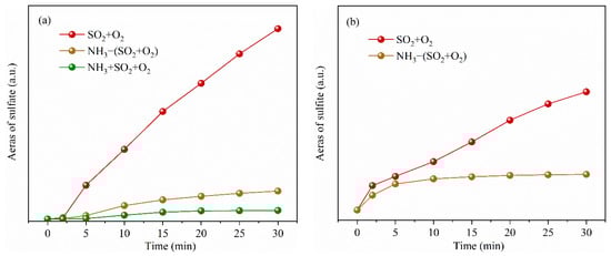 Intrinsically, NH3 as an alkaline gas can facilitate SO2 adsorption on ceria-based catalysts by the formation of ammonium sulfate-type species. Figure 6 shows the evolution of the typical sulfate bands (1300–1256 cm−1) and sulfite band (925 cm−1) over the CeNbTi catalyst that was treated by different poisoning procedures that were derived from Figure 5a,c,d, respectively. The peak areas of these bands were integrated and drawn as a function of time. In a simplified atmosphere (SO2 + O2), the sulfate bands increase in intensity continuously (Figure 6a), with cerium sulfate as the main product (Equation (2)), proven by the infrared spectra in Figure 4f and Figure 5a. It also correlates with the TG results (Table 1) that after the treatment in SO2+O2 for 6 h, about 13% of CeO2 transforms to cerium sulfate by assuming cerium sulfate as the dominating metal sulfate. Similarly, the sulfite band also obviously increases in intensity (Figure 6b), with the transformation of about 3% of CeO2 to cerium sulfites.