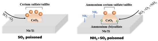 Schematic SO2 deactivation mechanisms over CeNbTi in the presence and absence of NH3.