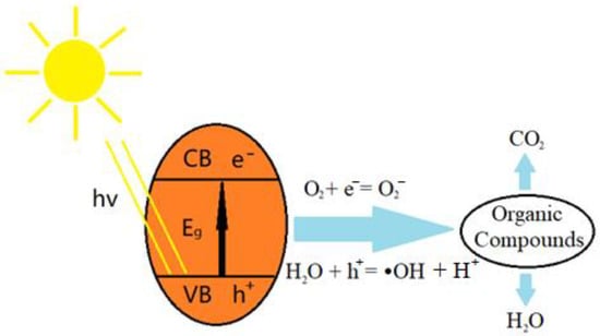 Figure 1 shows the proposed photocatalytic mechanism in the photocatalytic process. The surface of the photocatalyst is exposed to enough light intensity and generates electron-hole pairs. When the photocatalyst contacts the pollutant receptor, the holes (h+) on the surface of the photocatalyst would undergo oxidation-reduction reactions with organic pollutants. Moreover, strong oxidizing substances such as holes and hydroxyls produced by photocatalysts can degrade organic pollutants into CO2 and H2O. On the one hand, the content of holes is high, which plays the main role in oxidative degradation. On the other hand, hydroxyl has strong oxidation, but its content is low, which plays an auxiliary role in oxidation.