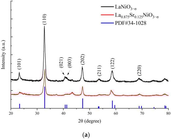 LaNiO3−σ and La1−xSrxNiO3−σ (x = 0.125) were prepared by the sol-gel method []. La(NO3)3·6H2O, Ni(CH2COOH)2·4H2O, and citric acid were dissolved in deionized water and stirred according to the stoichiometric ratio of 1:1:1.5 to prepare undoped LaNiO3−σ. After the raw material was completely dissolved, ammonia water was added to adjust the pH value of the solution to 8.0. Then the solution was placed in a water bath at 80 °C for 3 h, and the clear solution gradually turned into a viscous gel. The gel was put into a thermostatic drying oven at 150 °C for 24 h to obtain the dry gel. The dry gel was put into a crucible and calcined in a muffle furnace at 700 °C for 4 h. The calcined products were ground into a powder with an agate mortar. La(NO3)3·6H2O, Sr(CH2COOH)2, Ni(CH2COOH)2·4H2O, and citric acid were dissolved in deionized water for stirring according to the stoichiometric ratio of 1−x:x:1:1.5 to prepare La0.875Sr0.125NiO3−σ, followed by the same steps as the former preparation.